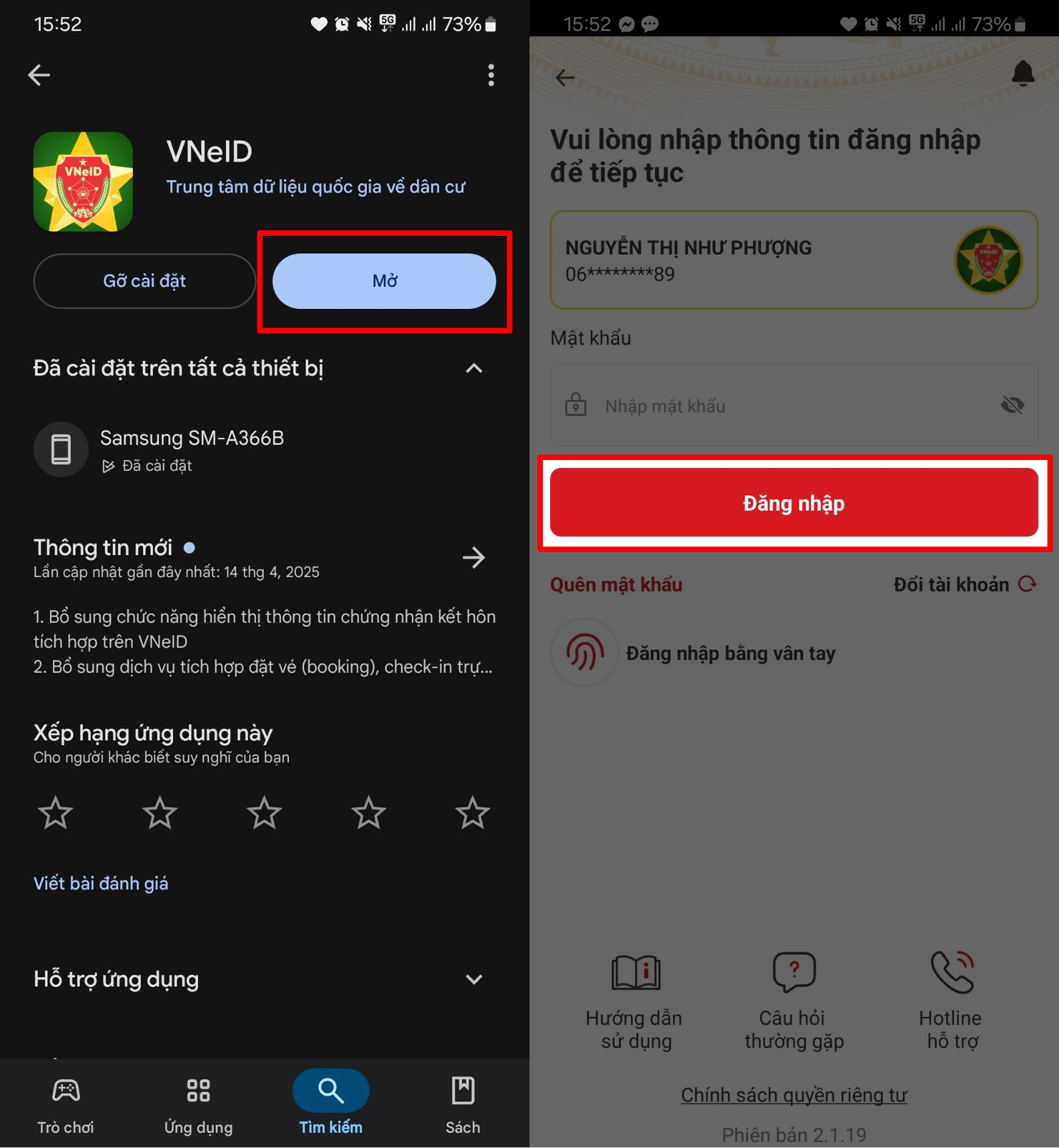 Bước 1: Mở ứng dụng VNeID trên điện thoại của bạn > Đăng nhập vào tài khoản cá nhân.