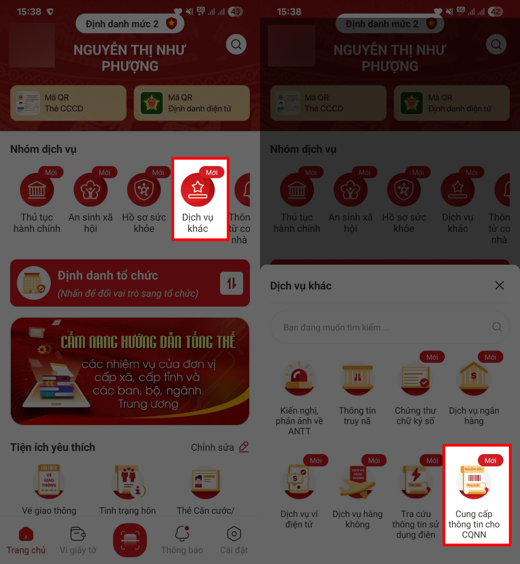 Bước 1: Ngay tại trang chủ của ứng dụng VNeID, nhấn vào mục Dịch vụ khác > Tiếp tục chọn mục Cung cấp thông tin cho CQNN.