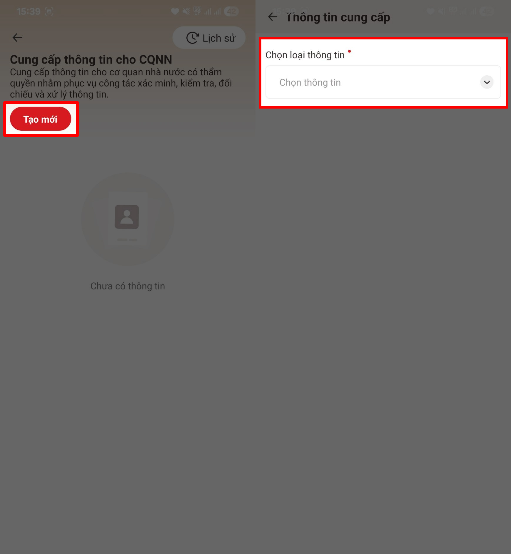Bước 2: Tạo mới yêu cầu cung cấp thông tin > Chọn loại thông tin mà bạn muốn gửi đến cơ quan chức năng.