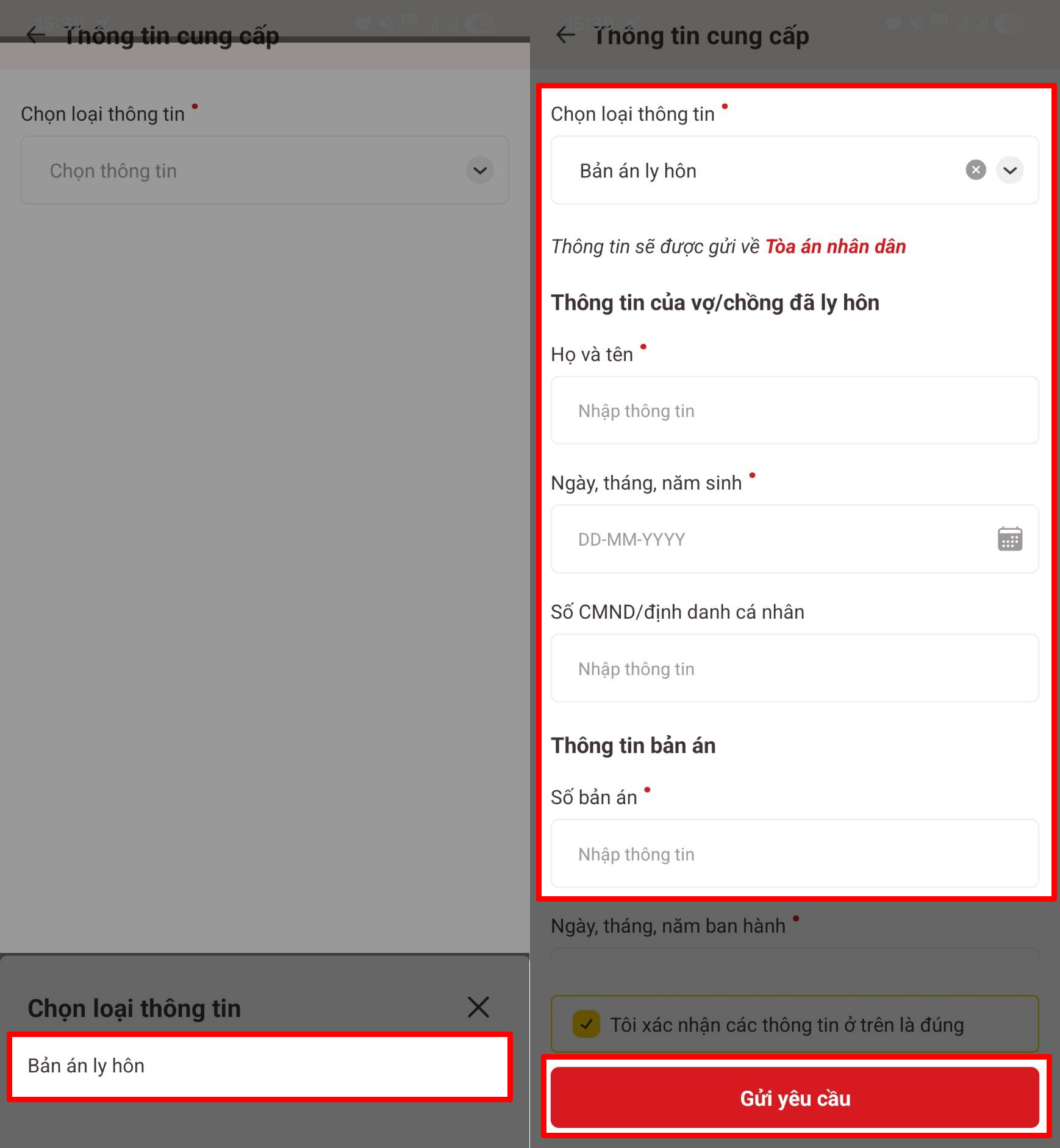 Bước 3: Chọn mục Bản án ly hôn > Điền đầy đủ các thông tin theo yêu cầu > Gửi hồ sơ đến cơ quan chức năng để xác nhận và cập nhật tình trạng ly hôn là hoàn tất.