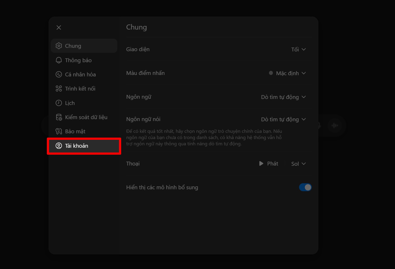 Bước 3: Trong phần Cài đặt, chọn vào Tài khoản để kiểm tra gói ChatGPT mà bạn đăng ký hiện tại.