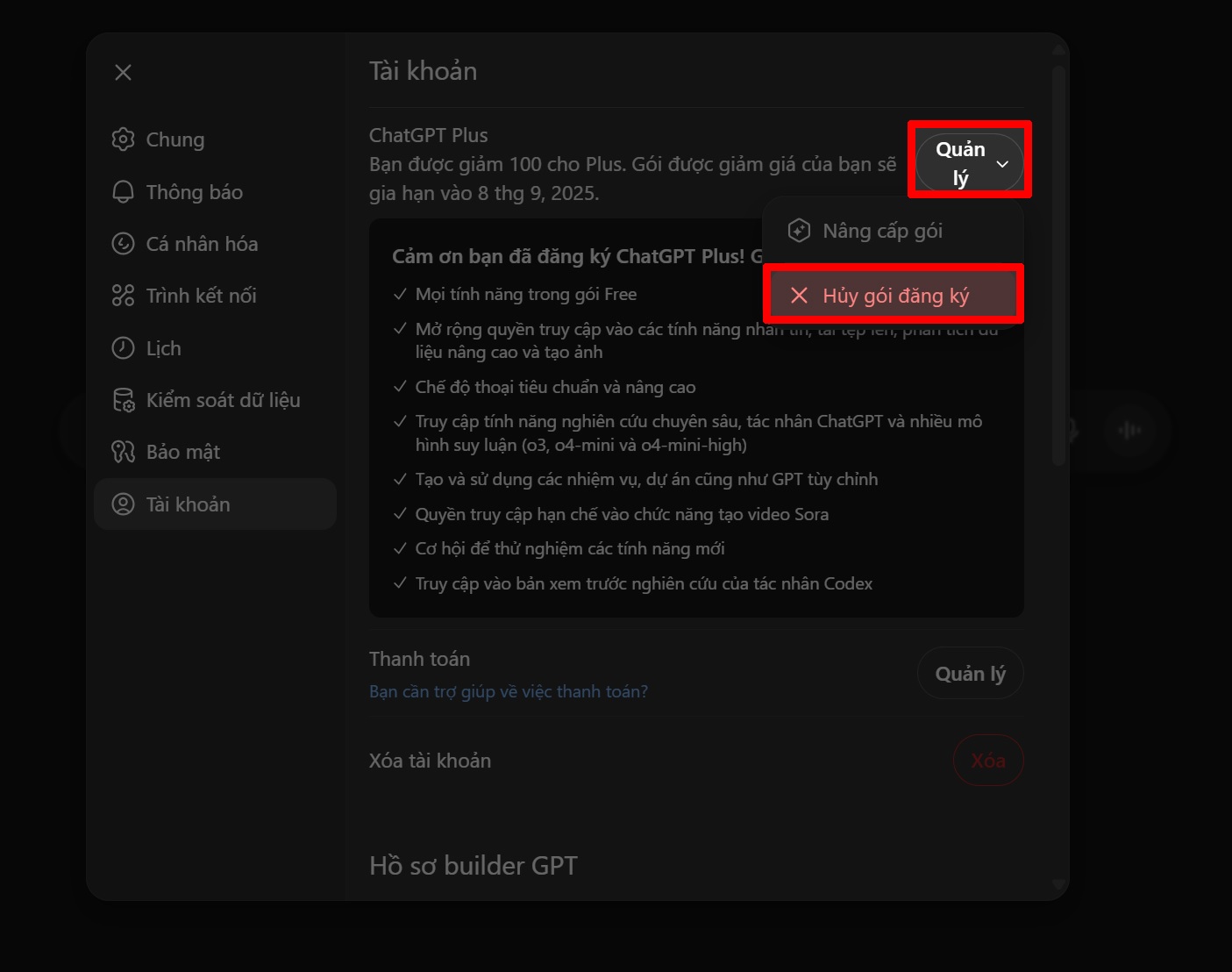 Cách hủy gói ChatGPT Plus