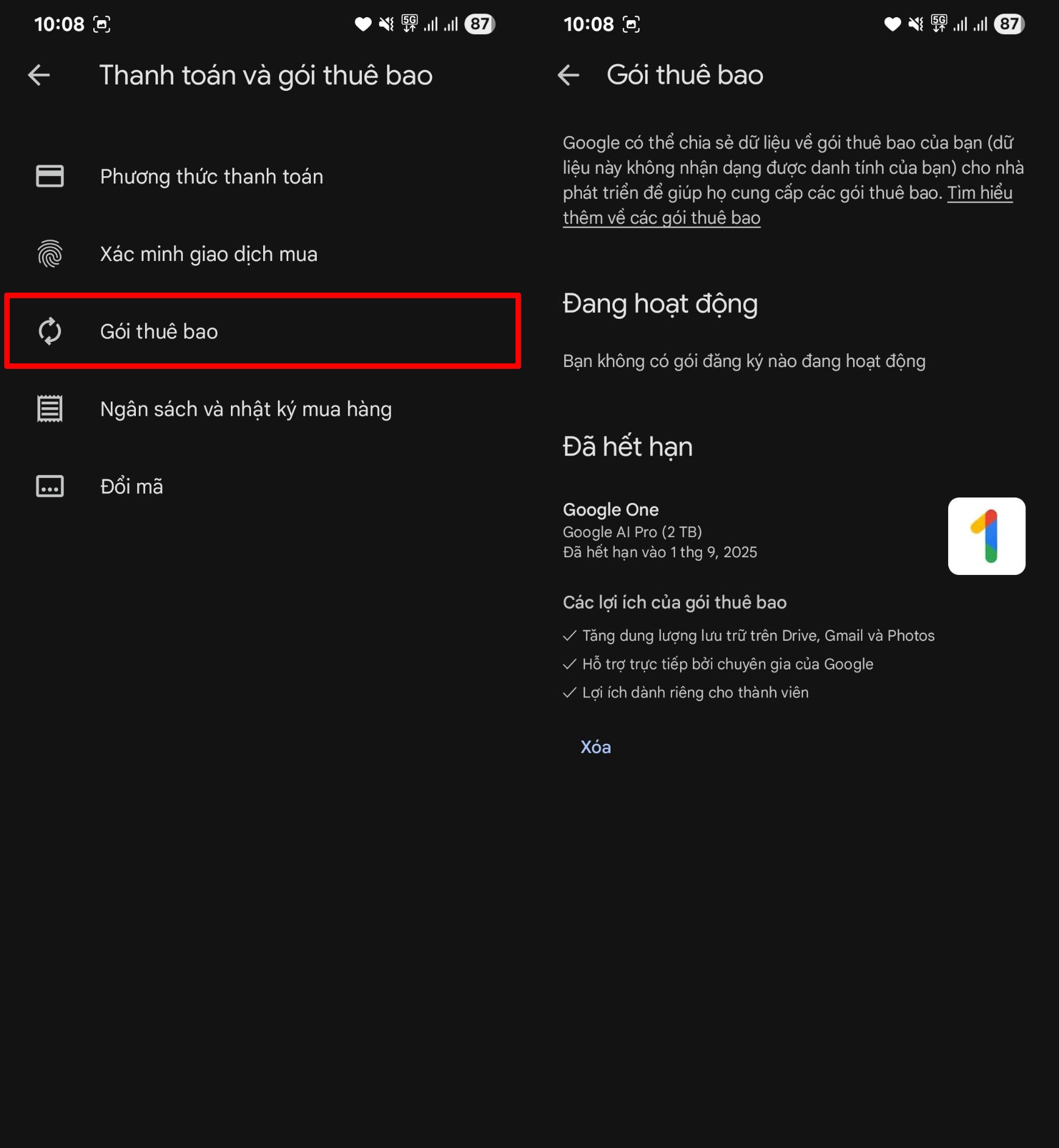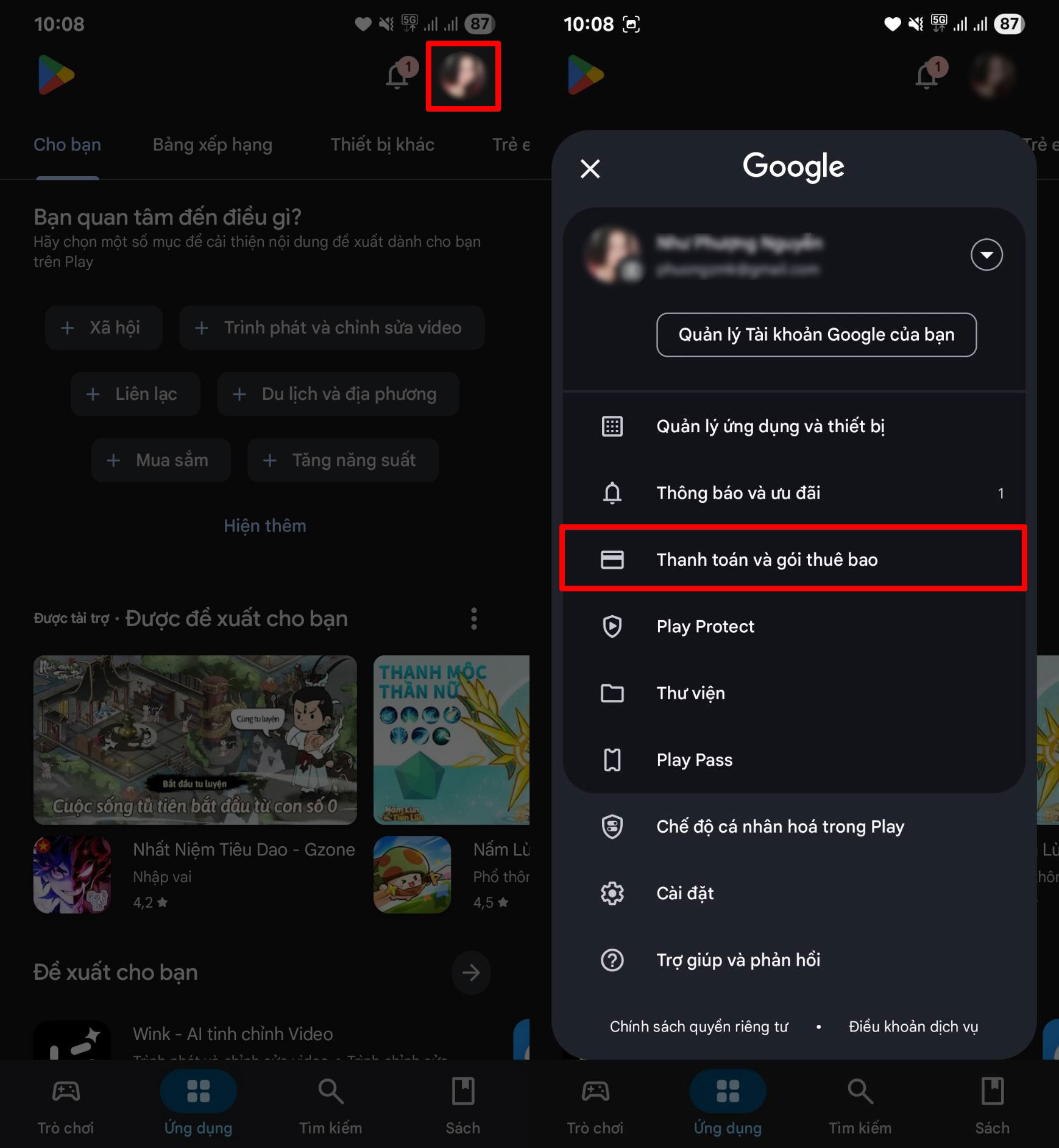 Bước 2: Vào phần thông tin tài khoản của bạn bằng cách nhấp vào hình Avatar nằm ở góc trên bên phải màn hình. Tìm Thanh toán và gói thuê bao để kiểm tra các dịch vụ mà bạn đăng ký.