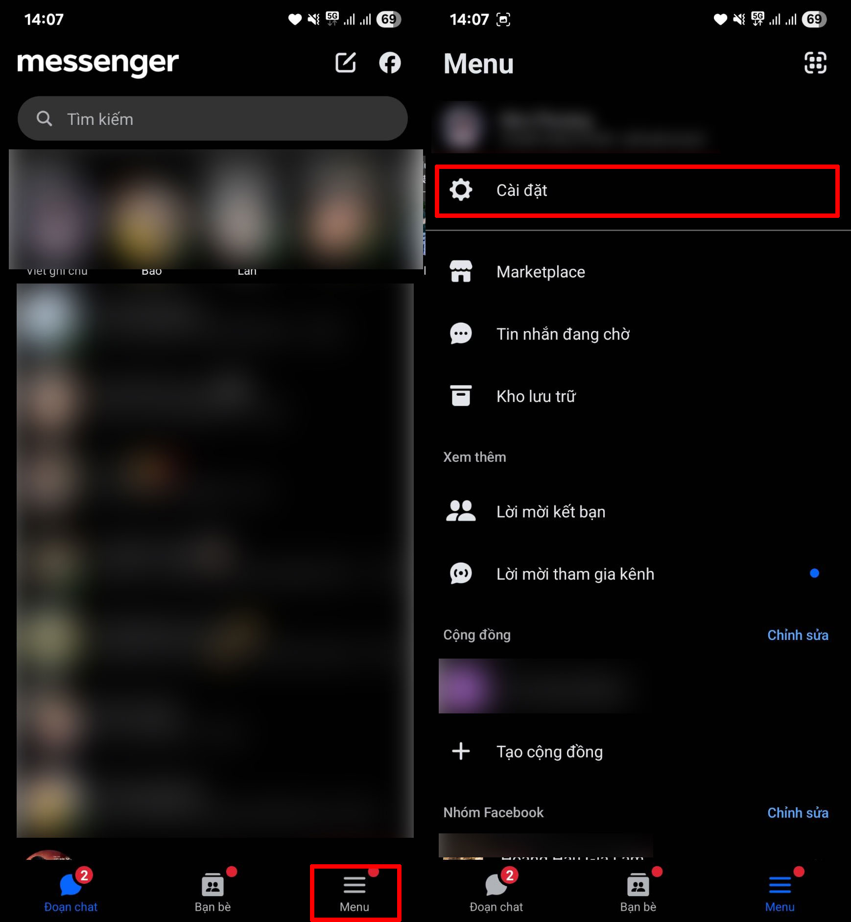Bước 2: Mở Messenger lên, nhấn chọn vào mục Menu bên dưới > Chọn tiếp vào mục Cài đặt để tiến hành sửa lỗi link TikTok trên Messenger.