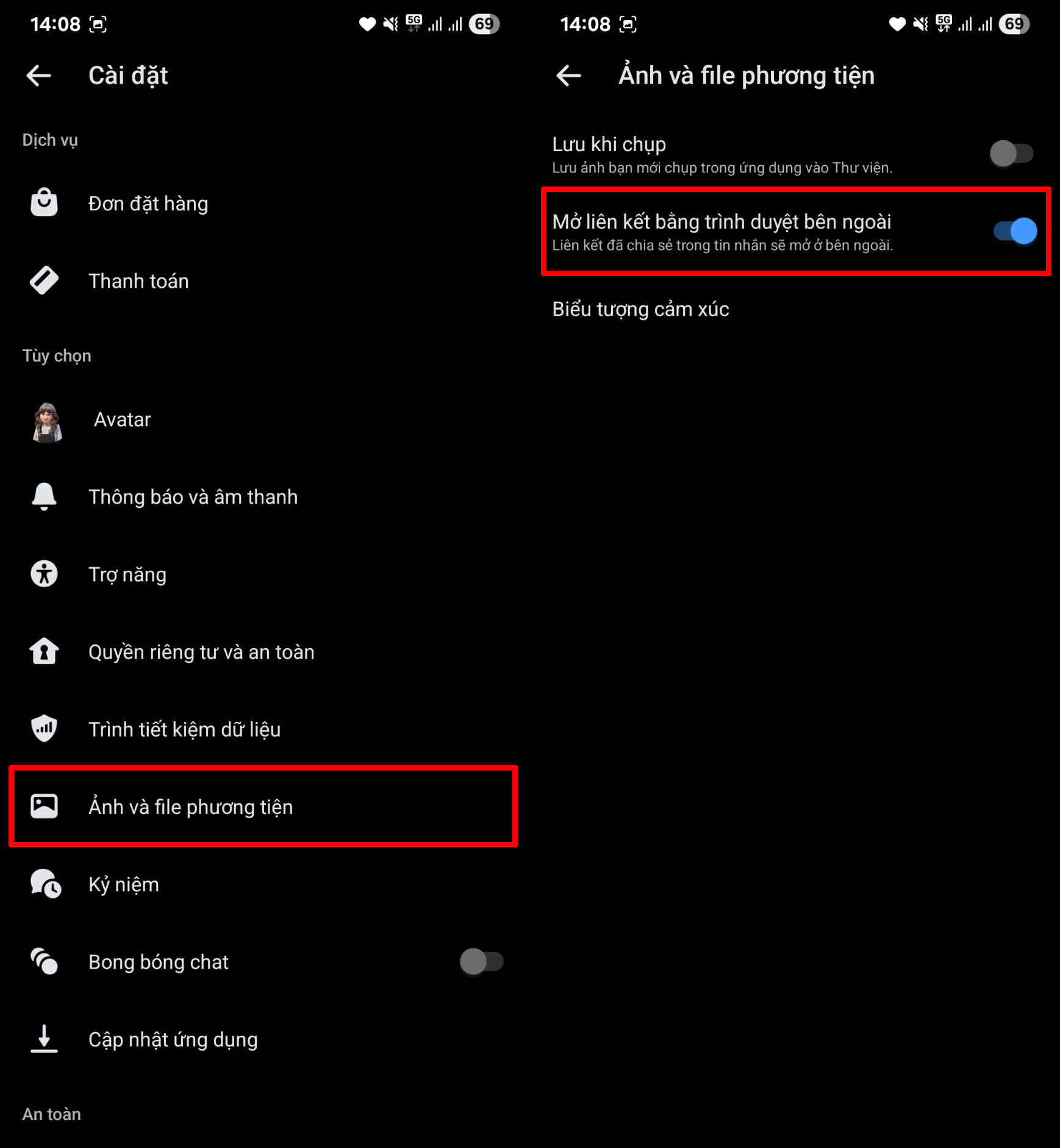 Bước 3: Kéo xuống dưới và chọn vào mục Ảnh và file phương tiện > Bật tùy chọn Mở liên kết bằng trình duyệt bên ngoài lên là xong.