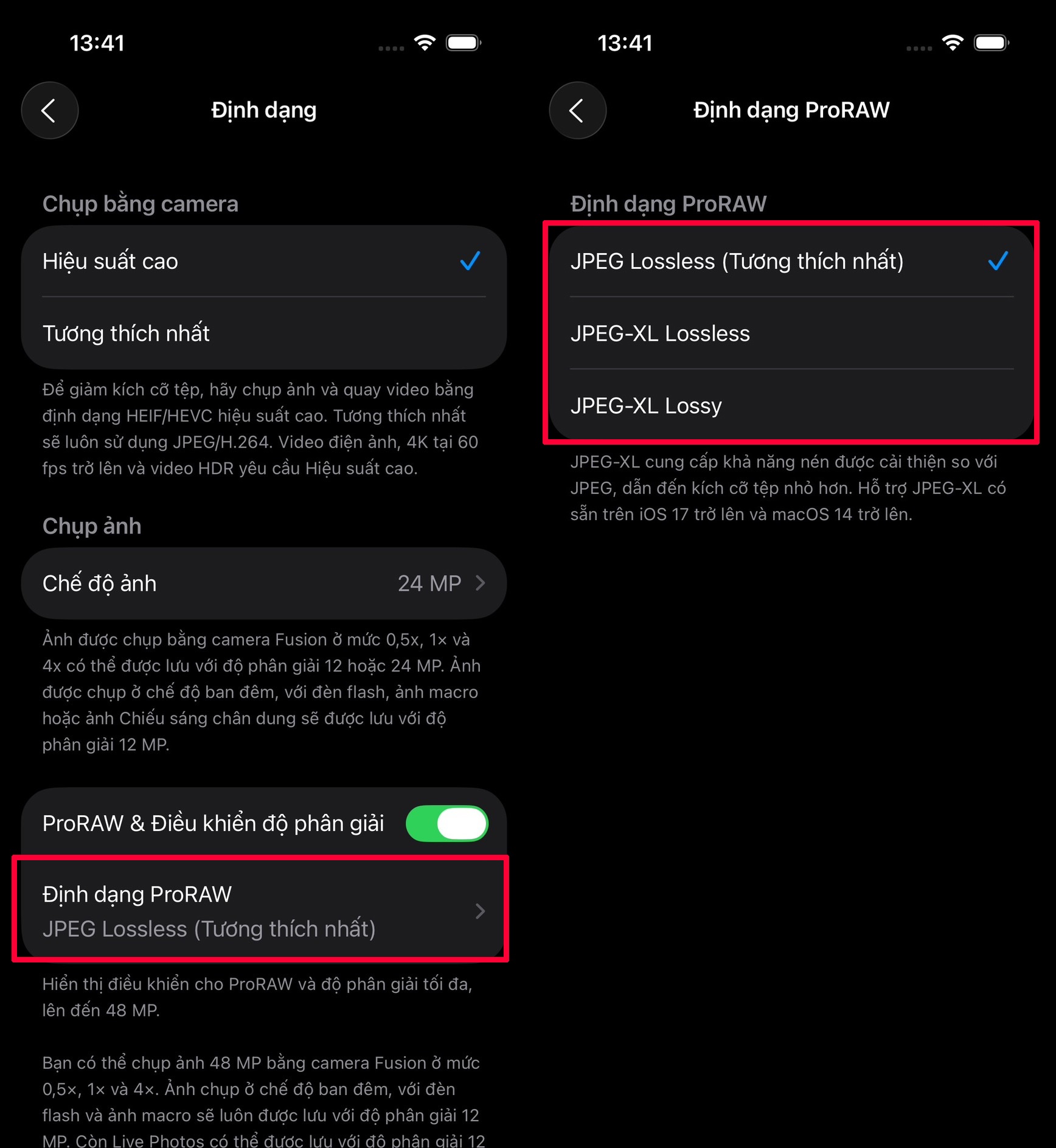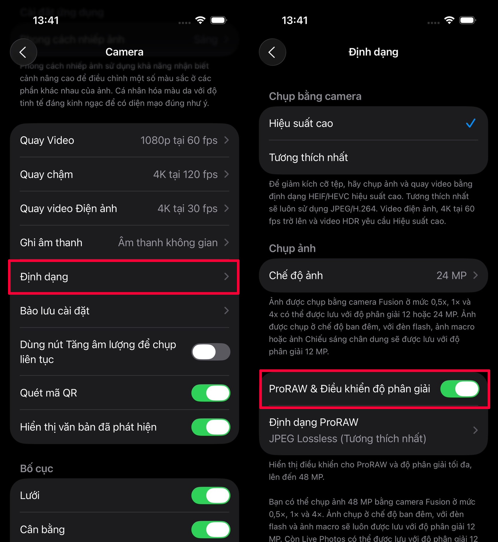 Thao tác: Cài đặt → Máy ảnh → Định dạng → Định dạng ProRAW → chọn độ phân giải mong muốn.