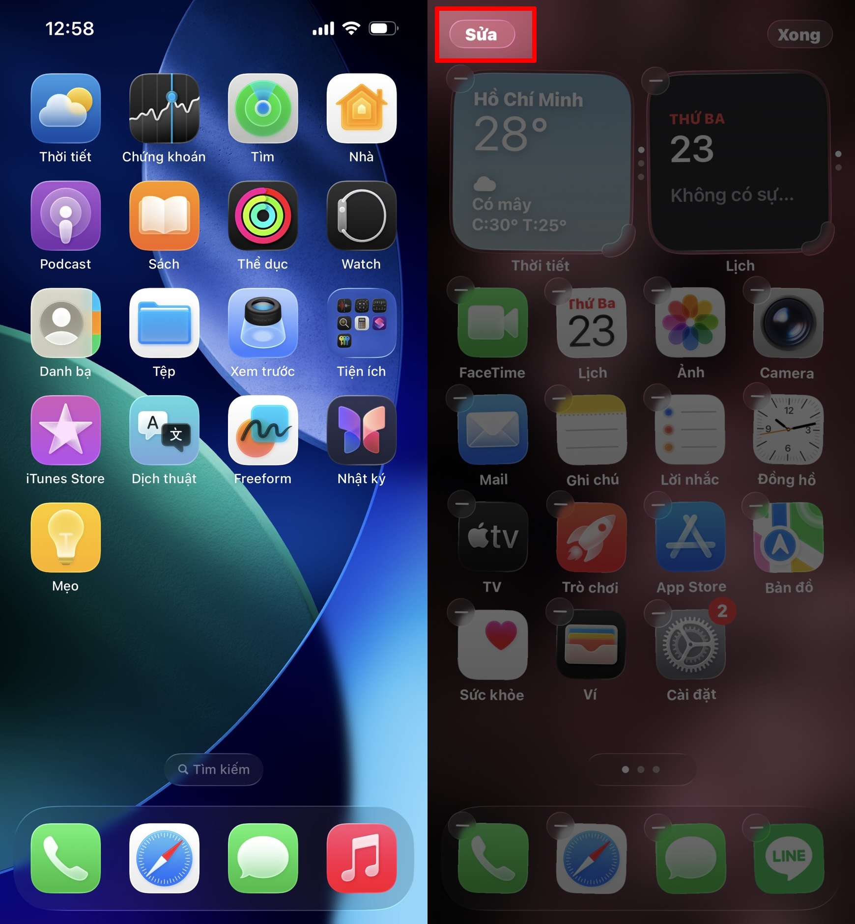 Khi các icon đã rung, chạm vào nút Chỉnh sửa ở góc trên bên trái.