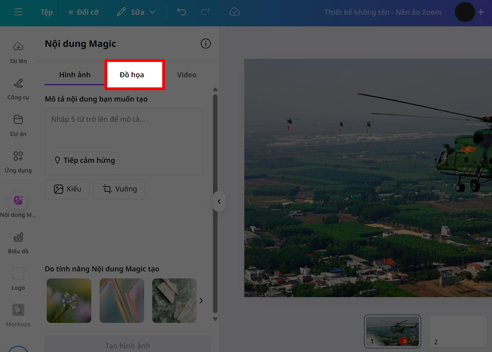 Bước 3: Chuyển sang mục Đồ họa > Bắt đầu quá trình tạo thành phần đồ họa tùy chỉnh bằng trí tuệ nhân tạo theo ý tưởng của bạn.