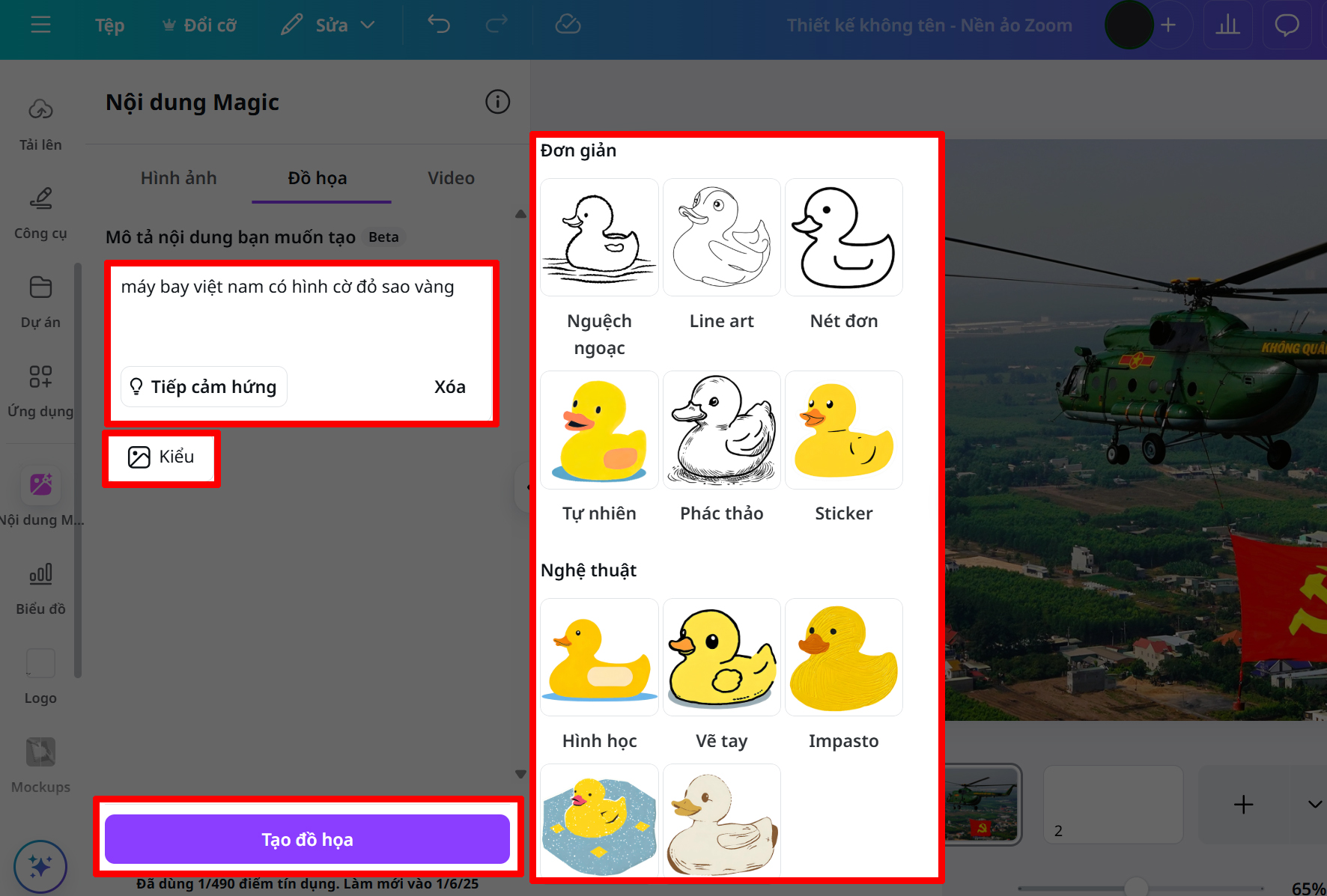 Bước 4: Nhập nội dung bạn muốn tạo đồ họa > Có thể nhập mô tả đơn giản hoặc thêm phong cách thiết kế nếu muốn, như tối giản, hoạt hình, cổ điển,…