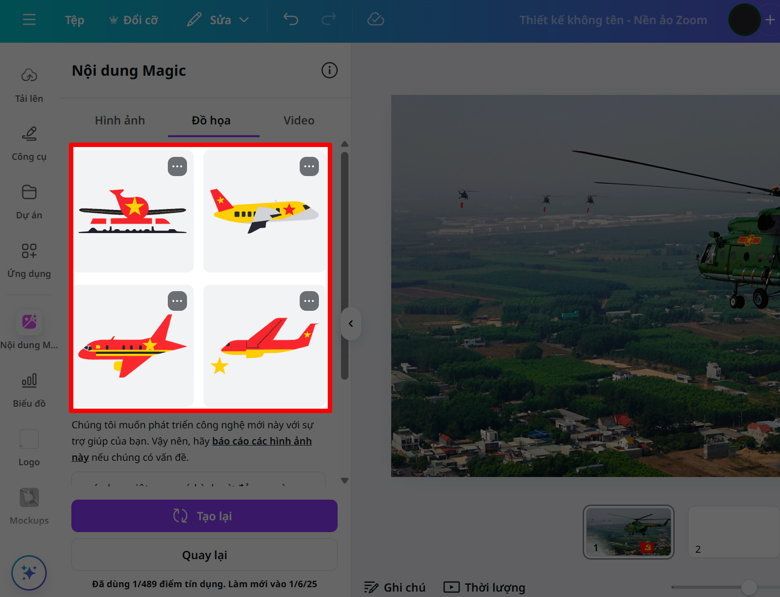 Bước 5: Chờ vài giây để Canva xử lý > Khi kết quả hiển thị, bạn chọn mẫu đồ họa mình thích > Nhấn vào để thêm trực tiếp vào thiết kế.
