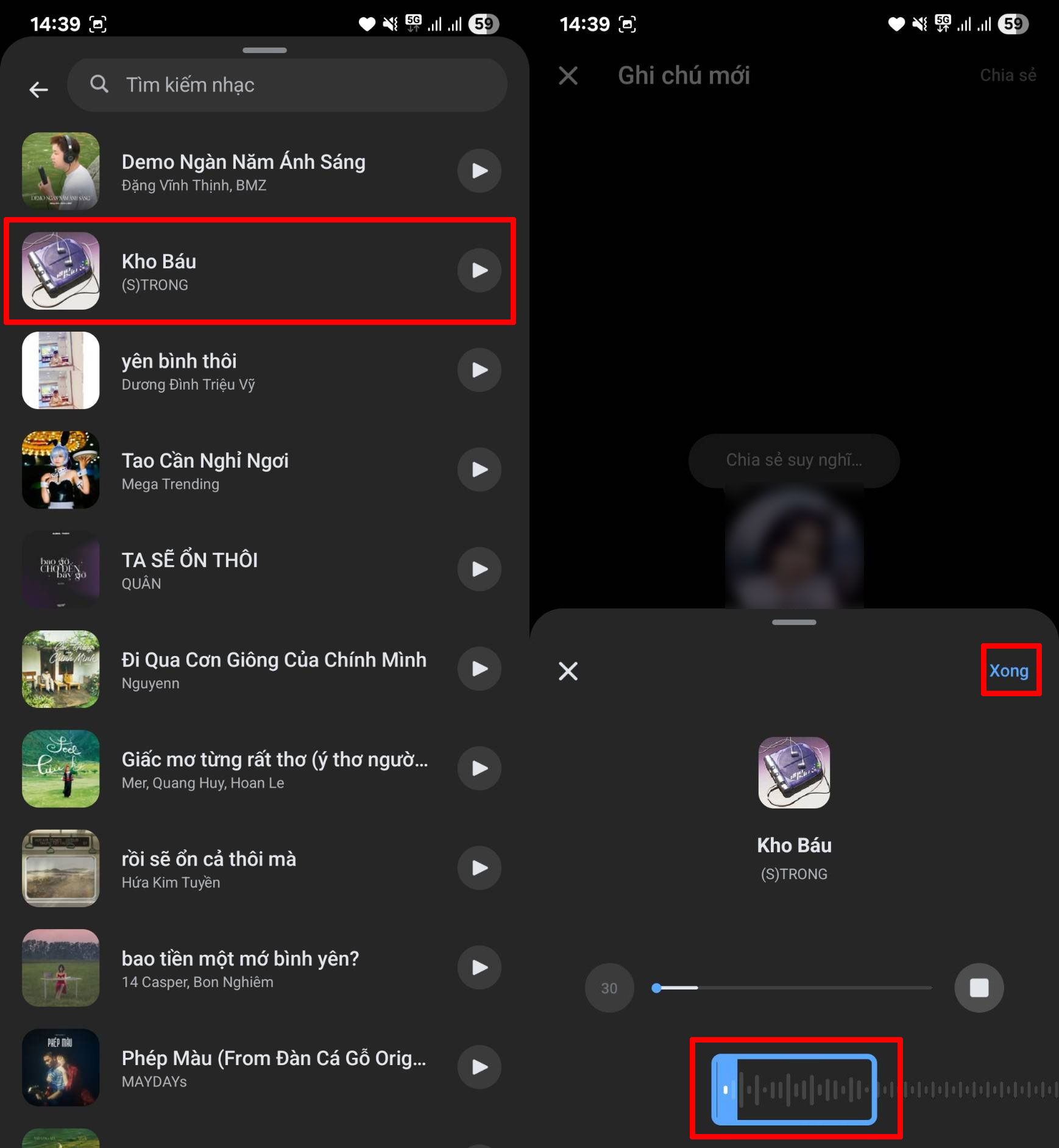 Bước 3: Sau khi nghe thử bài hát và thấy phù hợp với tâm trạng hoặc nội dung ghi chú, bạn nhấn vào tên bài hát để chọn > Messenger sẽ cho phép bạn kéo để chọn đoạn nhạc muốn sử dụng, thường khoảng 30 giây.