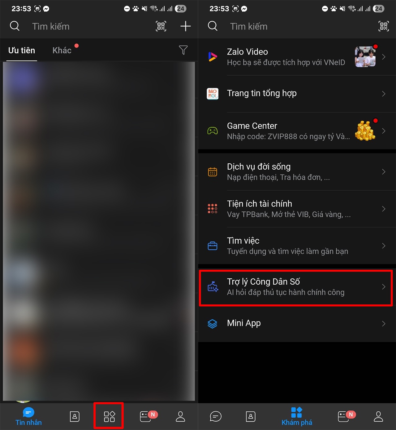 Bước 1: Mở ứng dụng Zalo > Nhấn vào mục Khám Phá nằm ở thanh menu. Tiếp tục chọn vào Trợ lý Công Dân Số. Khi truy cập xong, giao diện chat sẽ hiện ra trông khá giống đang nhắn tin với bạn bè, nhưng đầu dây bên kia là một “AI chính hiệu”, cực kỳ hiểu chuyện và lịch sự.
