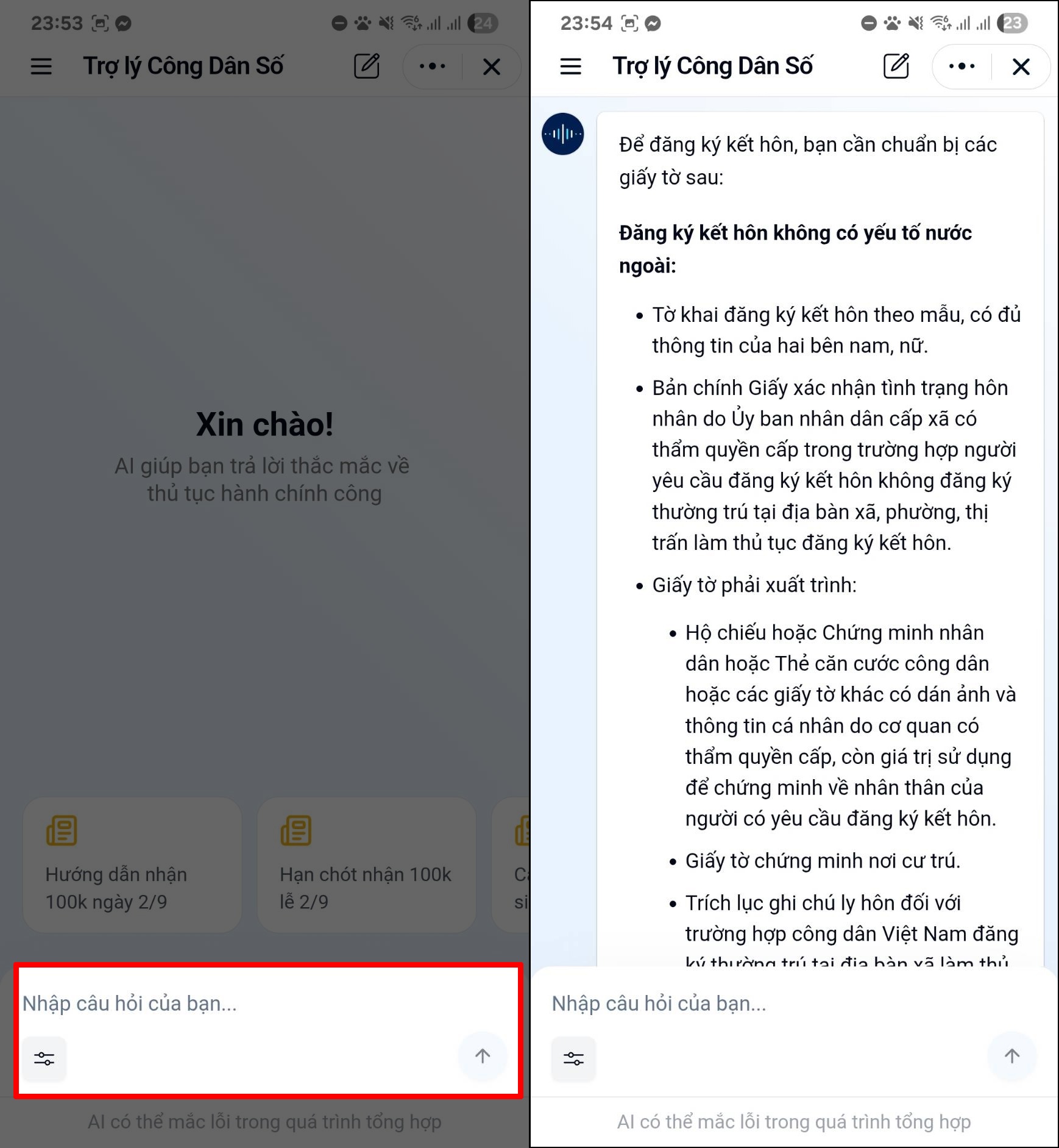 Bước 2: Tại giao diện của Trợ lý công dân số. Bạn có thể hỏi tự nhiên như nói chuyện: