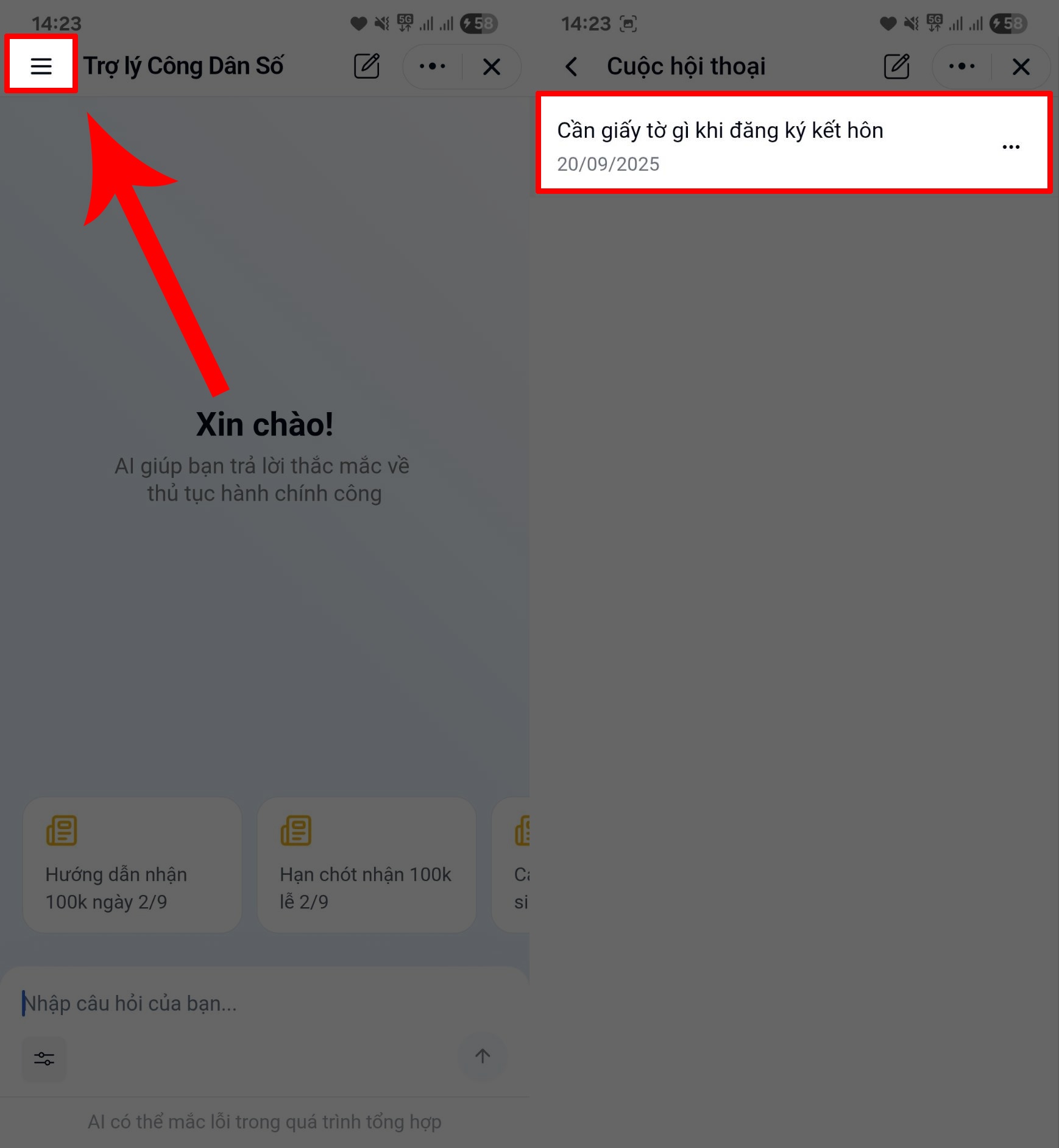 Ngoài ra, nếu muốn xem lại những nội dung đã từng hỏi trước đó, bạn có thể nhấn vào biểu tượng dấu 3 gạch ở góc màn hình. Tại đây, sẽ có lưu lại những mục mà bạn đã hỏi, giúp tiện theo dõi và tìm lại khi cần thiết.
