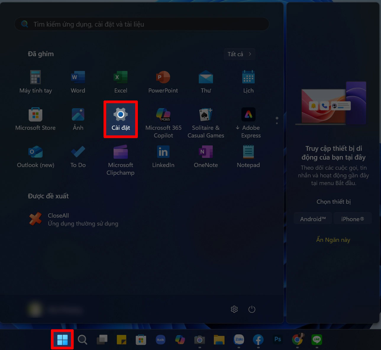 Bước 1: Nhấn chọn vào biểu tượng Windows trên thanh tác vụ > Chọn vào mục Cài đặt để truy cập các thiết lập hệ thống.