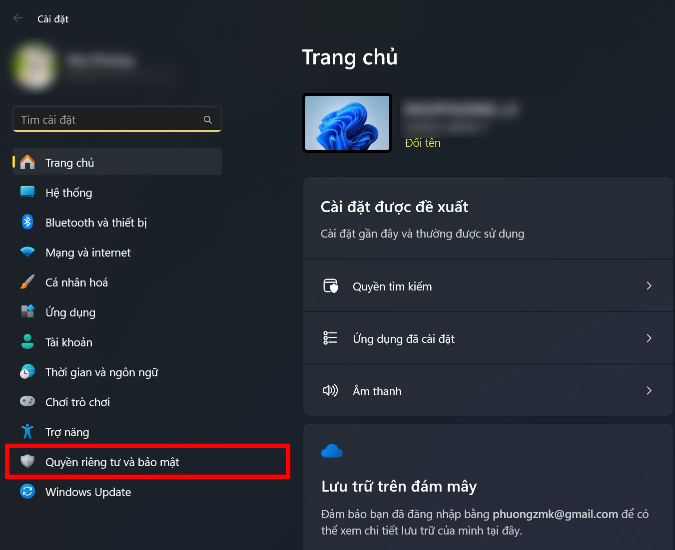 Bước 2: Trong giao diện Cài đặt, chọn tiếp vào mục Quyền riêng tư và bảo mật để quản lý các cài đặt liên quan đến dữ liệu cá nhân.