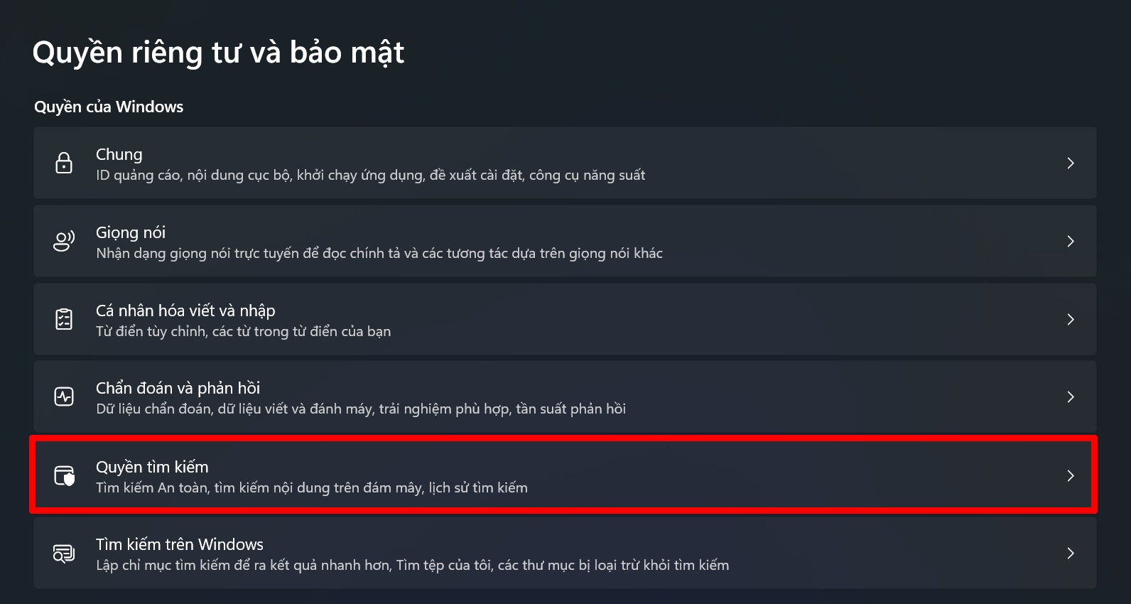 Bước 3: Tại danh sách bên trái, bạn hãy nhấn chọn vào Quyền tìm kiếm để điều chỉnh các thiết lập liên quan đến lịch sử tìm kiếm.