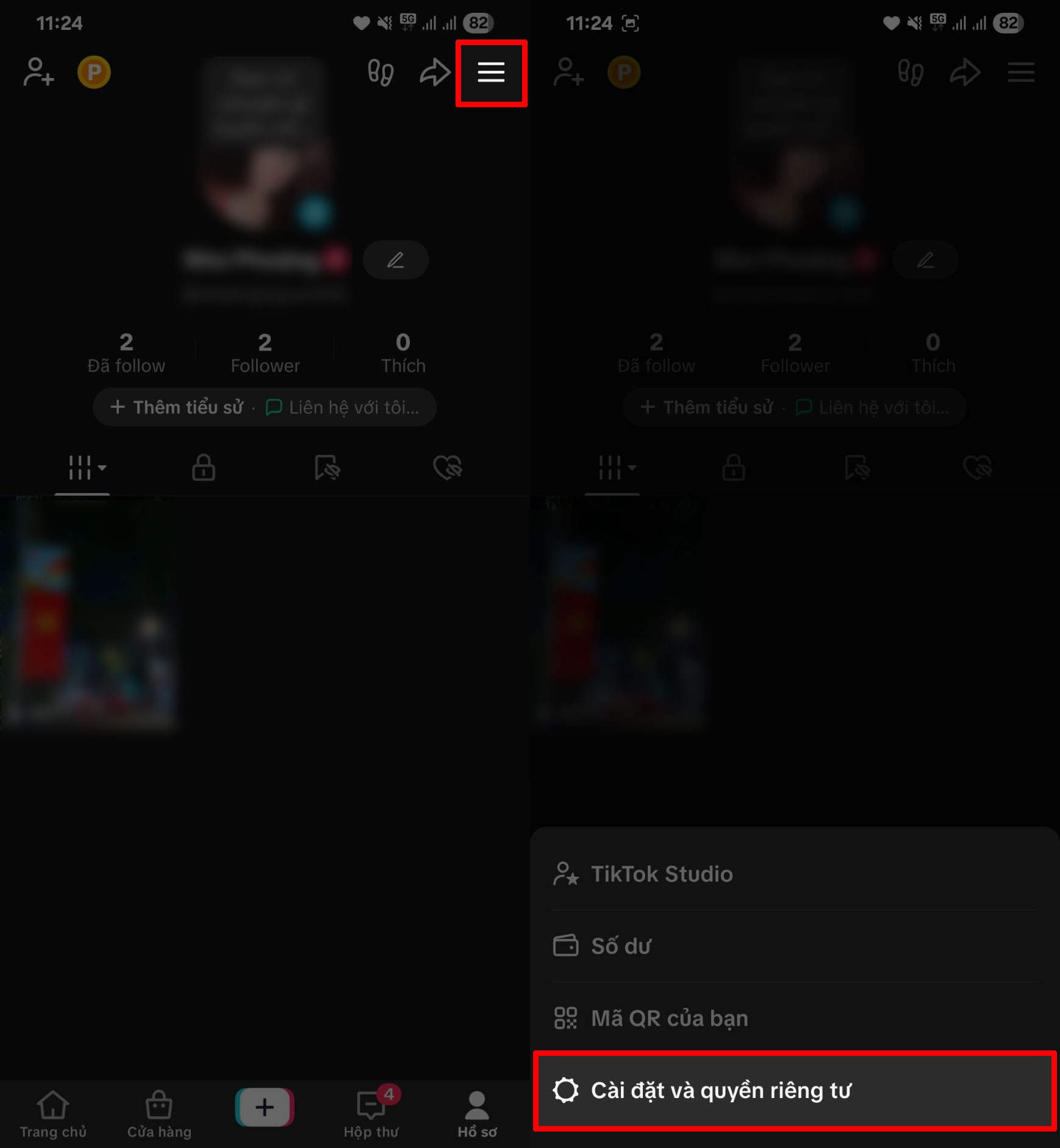 Bước 2: Tại trang hồ sơ, nhấn vào biểu tượng ba dấu gạch ngang hoặc ba chấm (☰) để mở menu Cài đặt và quyền riêng tư.