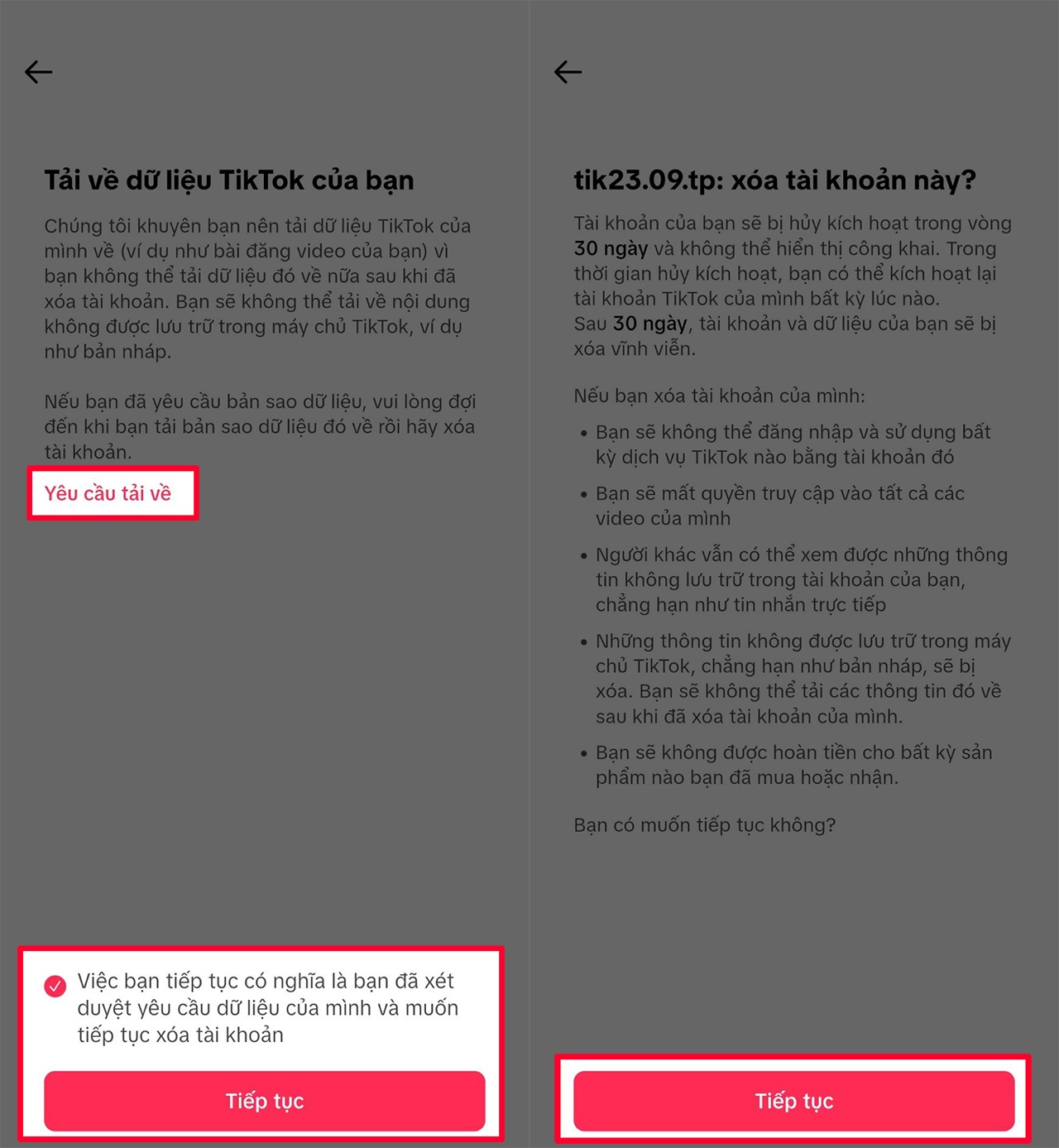 Bước 5: Trước khi tiến hành xóa tài khoản TikTok bạn vẫn có thể tải sao lưu dữ liệu của tài khoản về máy. Sau đó, bạn chọn Tiếp tục để tiến hành xóa tài khoản. Sẽ thông báo rằng tài khoản sẽ bị vô hiệu hóa trong 30 ngày trước khi bị xóa hoàn toàn.