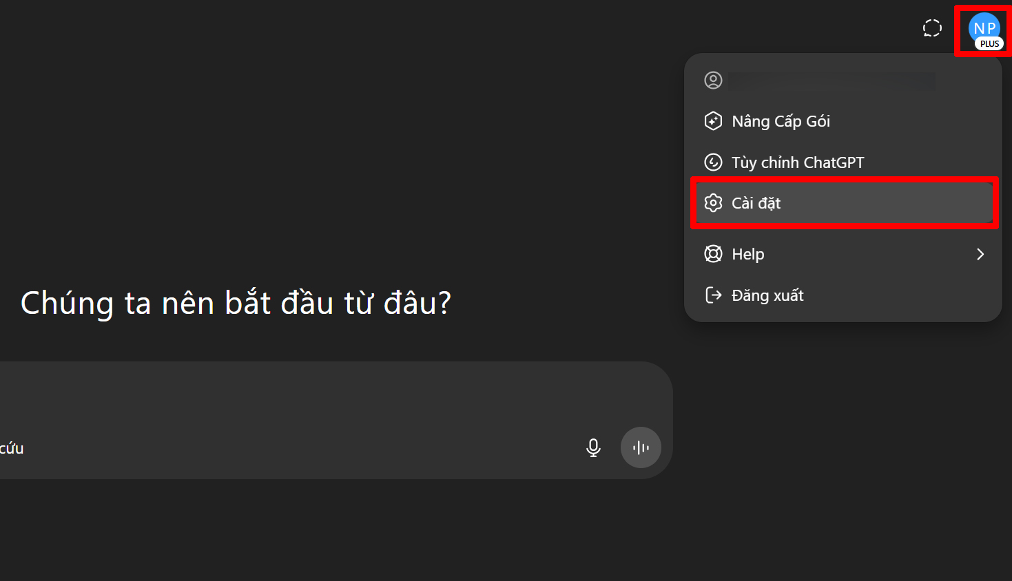 Bước 1: Nhấn vào biểu tượng ảnh đại diện (avatar) của bạn ở góc dưới bên trái trong giao diện ChatGPT, sau đó chọn mục Cài đặt để truy cập phần thiết lập tài khoản.