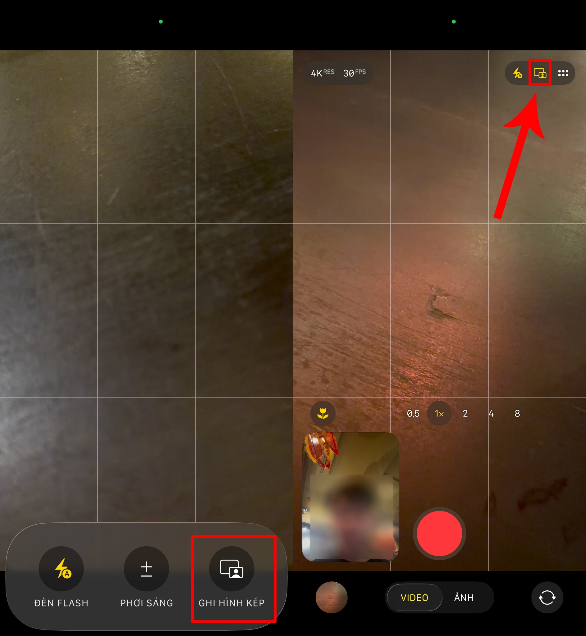 Sau khi bật, trên giao diện quay video sẽ xuất hiện một biểu tượng nhỏ báo rằng bạn đang ở chế độ “ghi hình kép”. Nếu cần, bạn có thể chạm để bật/tắt nhanh mà không cần thoát ra menu cấu hình.