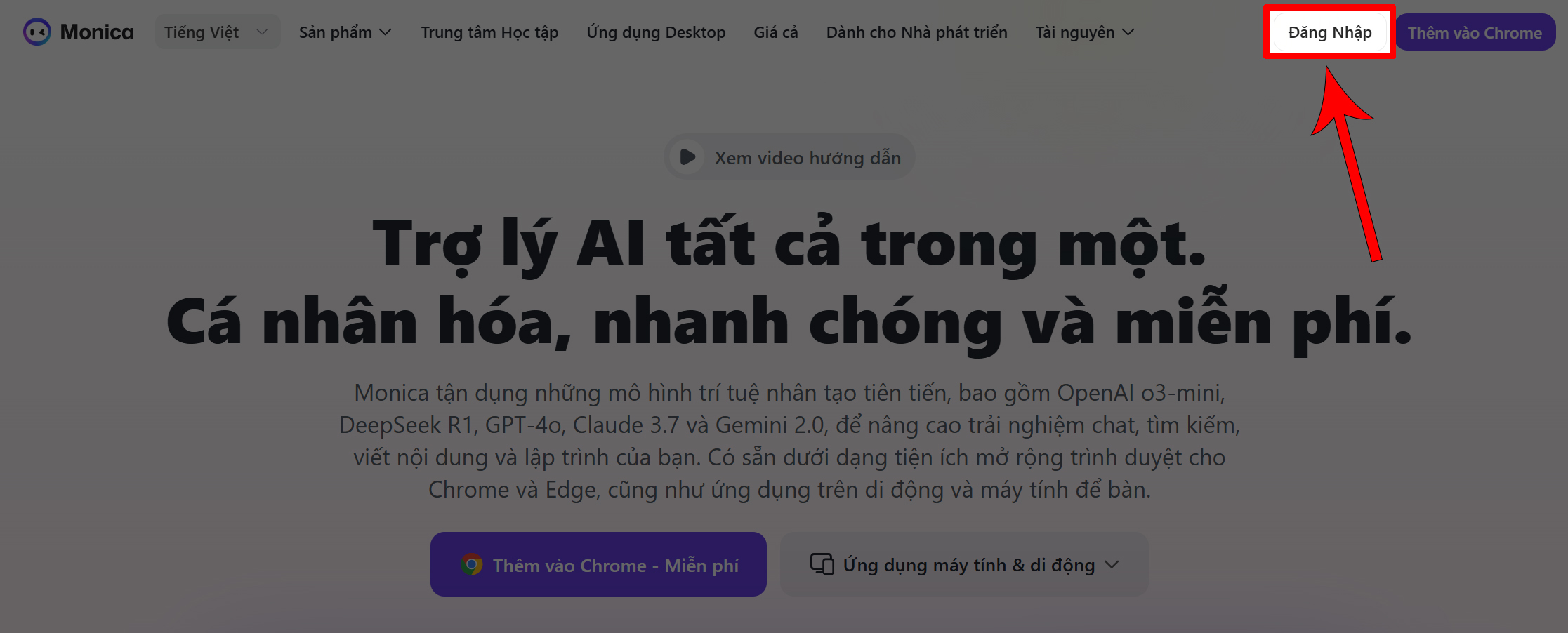 Bước 1: Truy cập vào đường link Monica bên dưới, sau đó chọn mục Đăng nhập.
