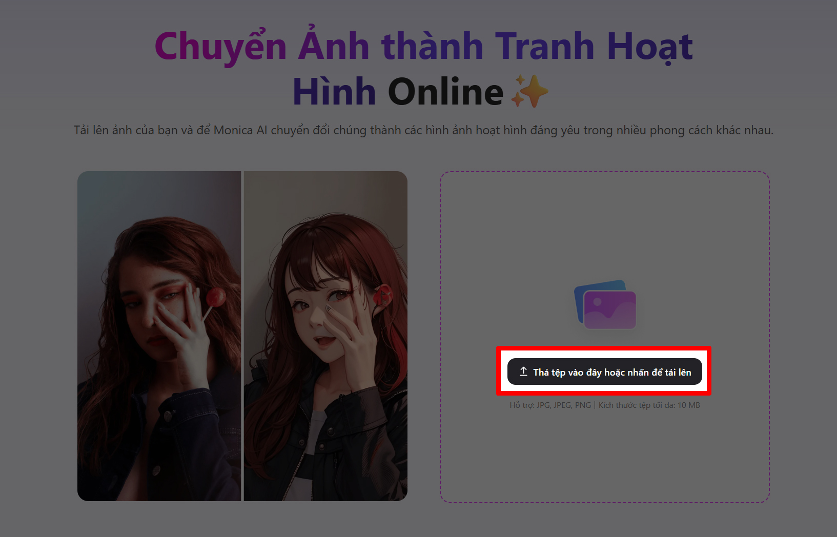 Bước 3: Tiếp tục truy cập vào đường link chuyển ảnh thành ảnh hoạt hình bên dưới rồi tải ảnh của bạn lên hệ thống.