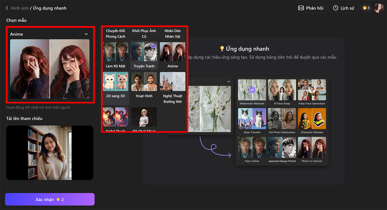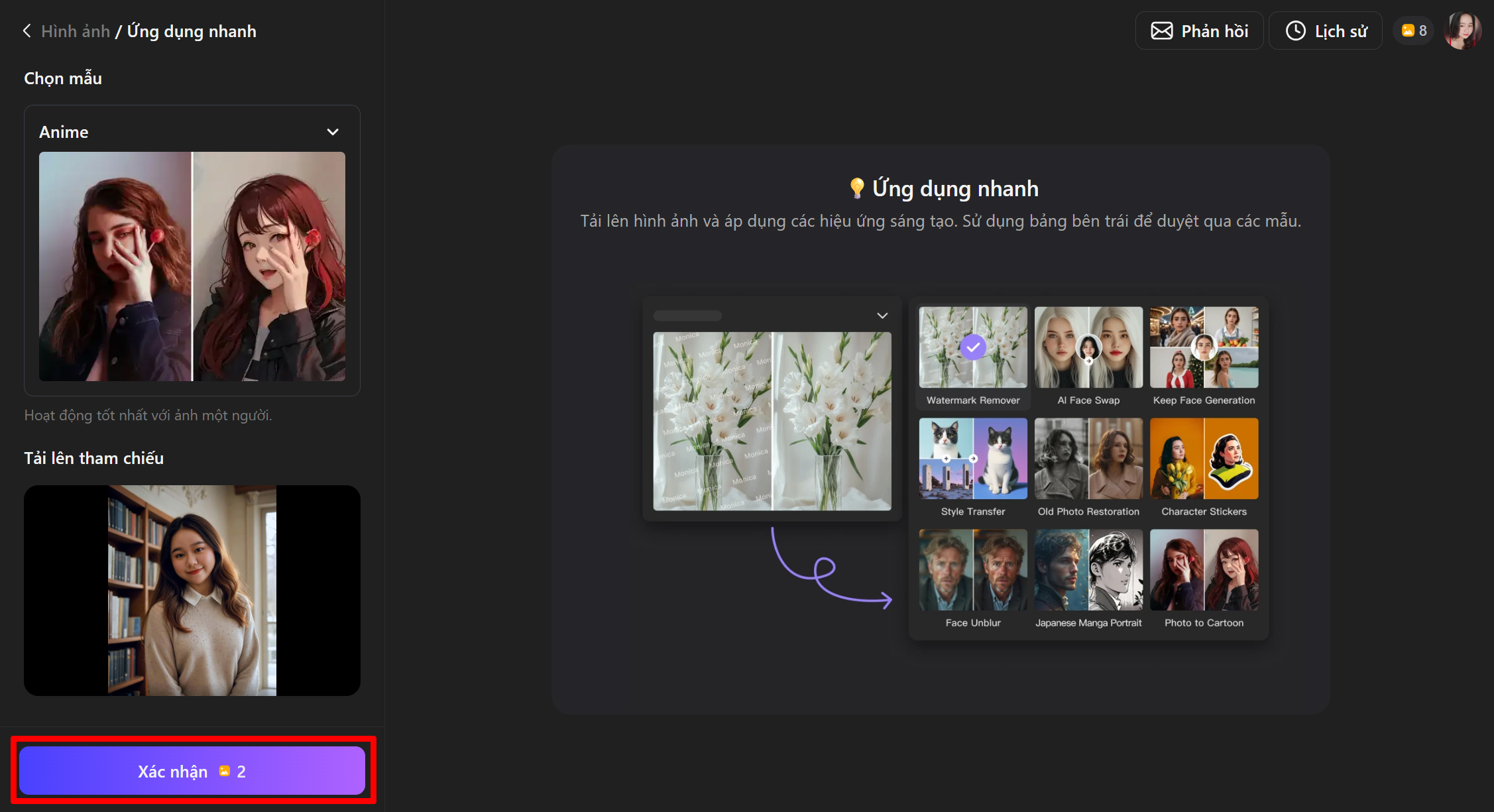 Bước 4: Nhấn vào mục Xác nhận để AI bắt đầu quá trình chuyển đổi ảnh thành phong cách hoạt hình.