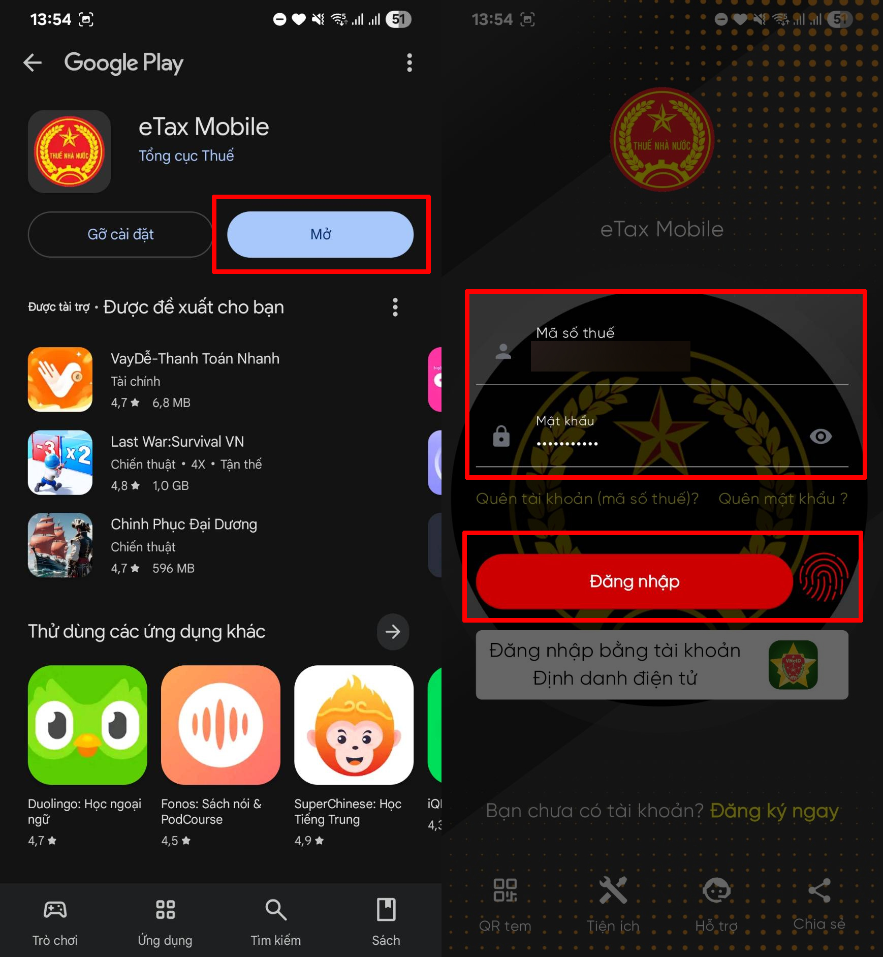 Bước 2: Mở ứng dụng Thuế điện tử trên điện thoại của bạn > Đăng nhập vào tài khoản thuế cá nhân đã đăng ký trước đó.