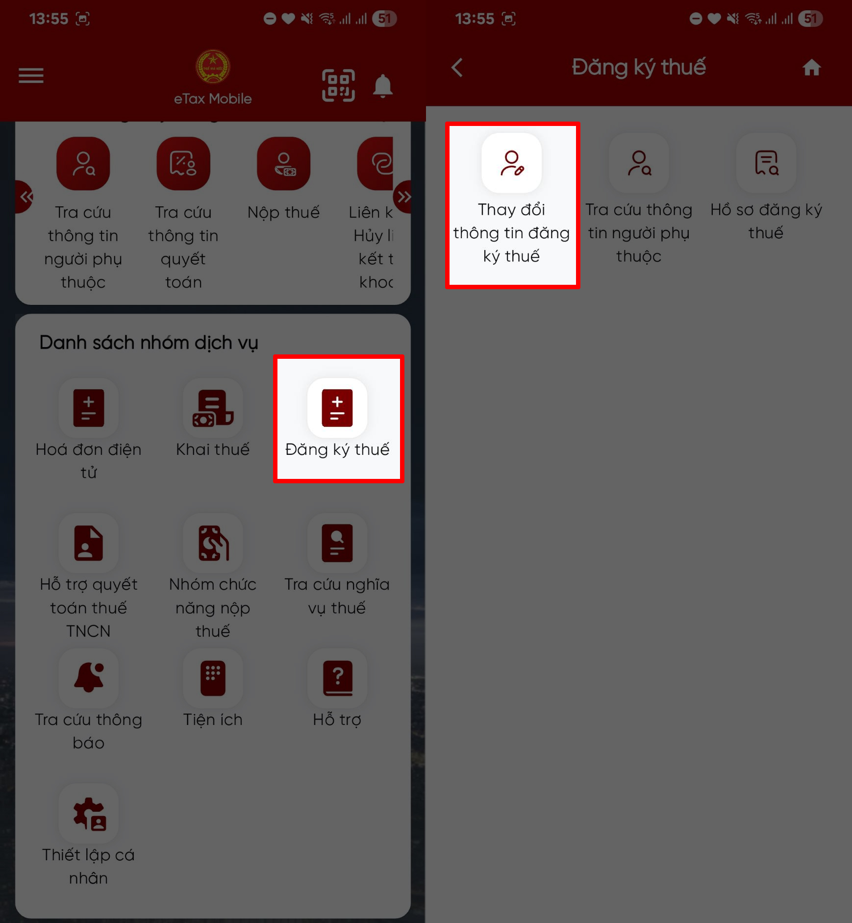 Bước 3: Tại giao diện chính, nhấn vào mục Đăng ký thuế > Chọn tiếp mục Thay Đổi Thông Tin ĐKT.