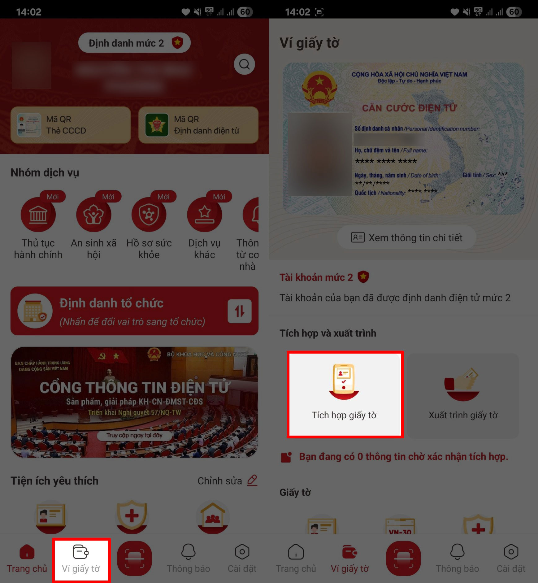 Bước 2: Tại giao diện trang chủ, tìm và chọn Ví giấy tờ > Sau đó, chọn vào mục Tích hợp giấy tờ để bắt đầu quá trình liên kết.