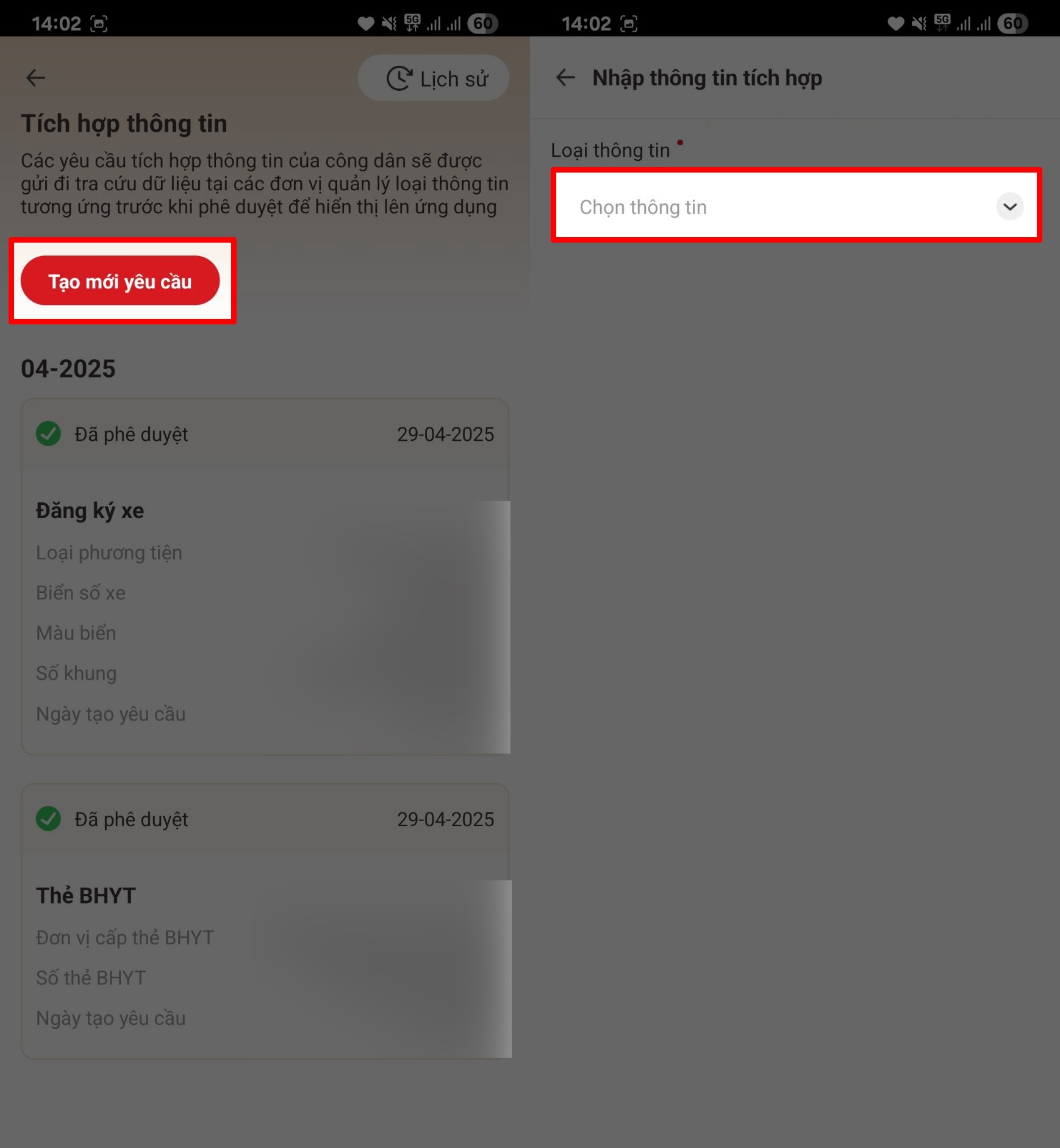 Bước 3: Trong danh sách, chọn Tạo mới yêu cầu > Tại Nhập thông tin tích hợp nhấn vào mục Chọn thông tin để xác định loại giấy tờ mà bạn muốn tích hợp vào ứng dụng.