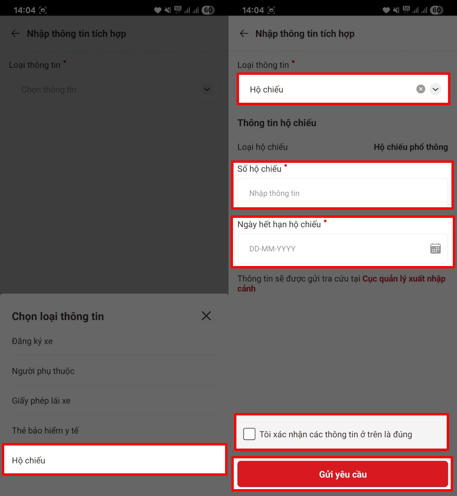 Bước 4: Chọn vào Hộ chiếu > Điền đầy đủ và chính xác các thông tin được yêu cầu trong hộ chiếu > Đánh dấu tick tôi xác nhận các thông tin ở trên là đúng và cuối cùng nhấn Gửi yêu cầu để hoàn tất việc tích hợp.