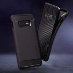 Ốp lưng Galaxy S10e chính hãng Spigen Rugged Armor chống sốc phong cách sang trọng với kiểu thiết kế bề mặt đen mờ lâu cũ và chi tiết sợi cacbon ở 2 đầu ốp.