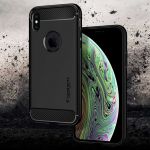 Ốp lưng iPhone X chính hãng Spigen Rugged Armor chống sốc phong cách sang trọng với kiểu thiết kế bề mặt đen mờ lâu cũ và chi tiết sợi cacbon ở 2 đầu ốp.