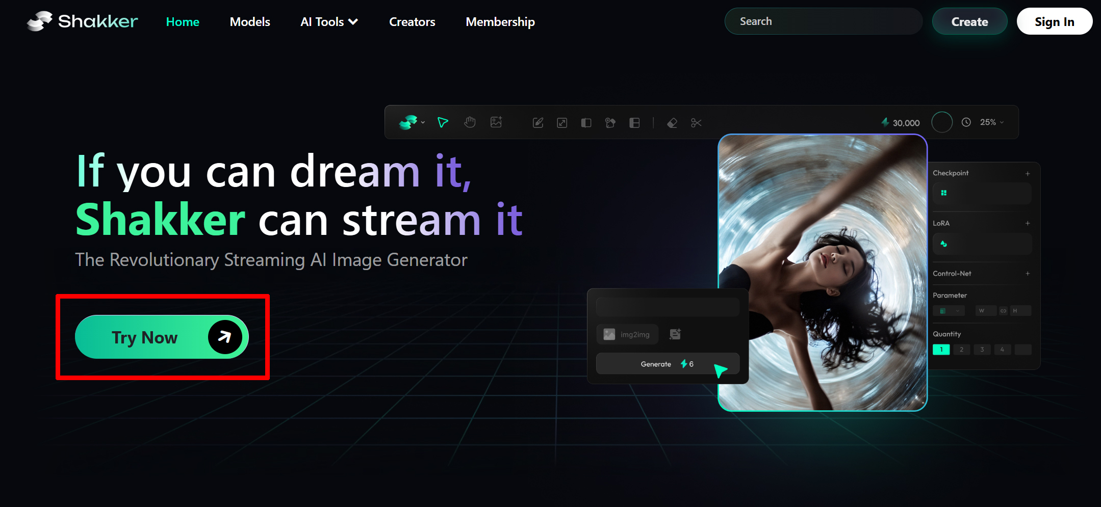 Bước 1: Nhấn vào đường link bên dưới để truy cập vào trang chủ của Shakker AI. Tại giao diện chính, bạn hãy nhấn vào nút Try Now để bắt đầu sử dụng công cụ.