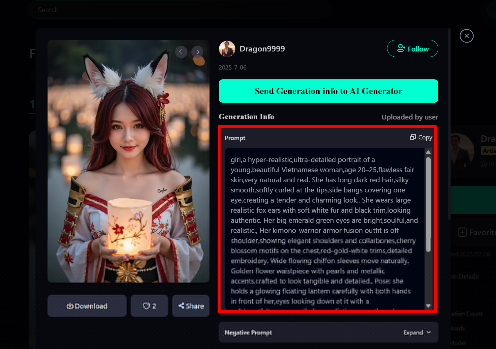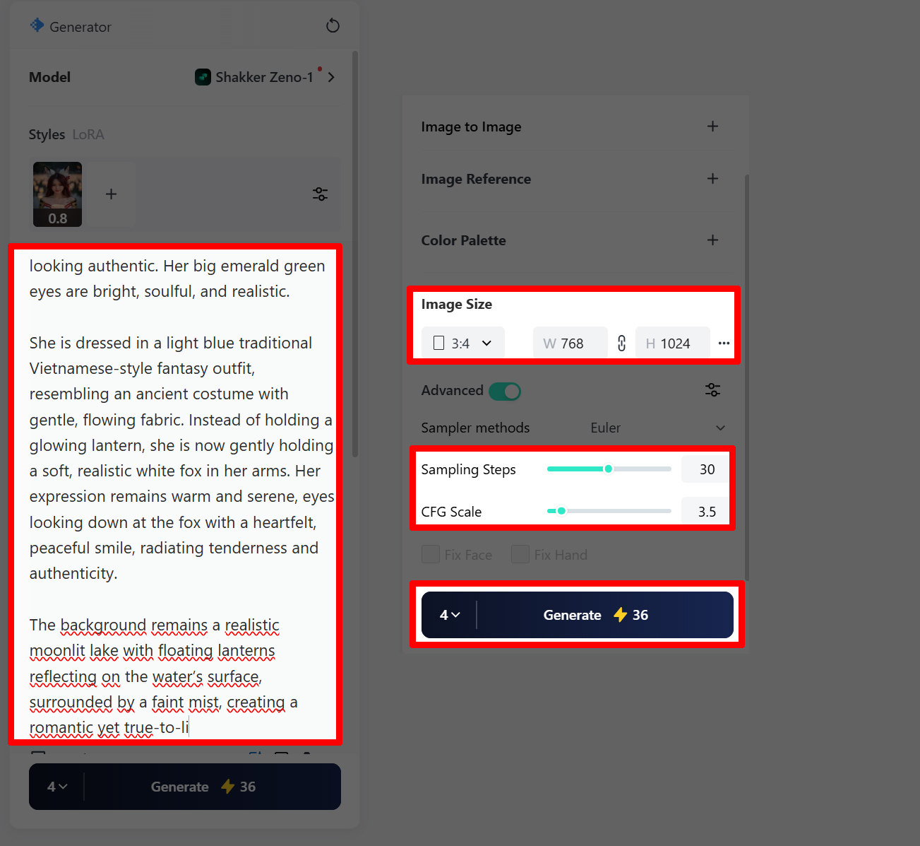 Bước 4: Tiếp theo, bạn dán phần mô tả đã chỉnh sửa vào ô nhập liệu, sau đó điều chỉnh các thông số như độ chi tiết, phong cách ảnh, ánh sáng,... sao cho phù hợp với nhu cầu của bạn trước khi bắt đầu tạo ảnh.