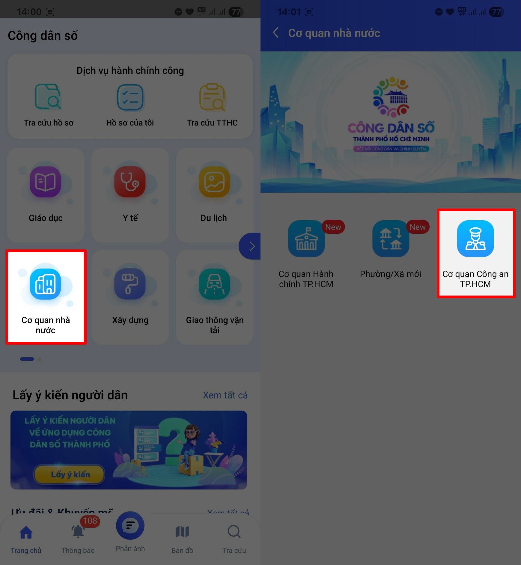 Bước 2: Tại giao diện chính, lướt màn hình điện thoại xuống phía dưới và tìm vào mục Cơ quan Nhà nước. Tại đây, tiếp tục chọn vào mục Cơ quan Công an TP.HCM để tra cứu thông tin các đơn vị công an trực thuộc.