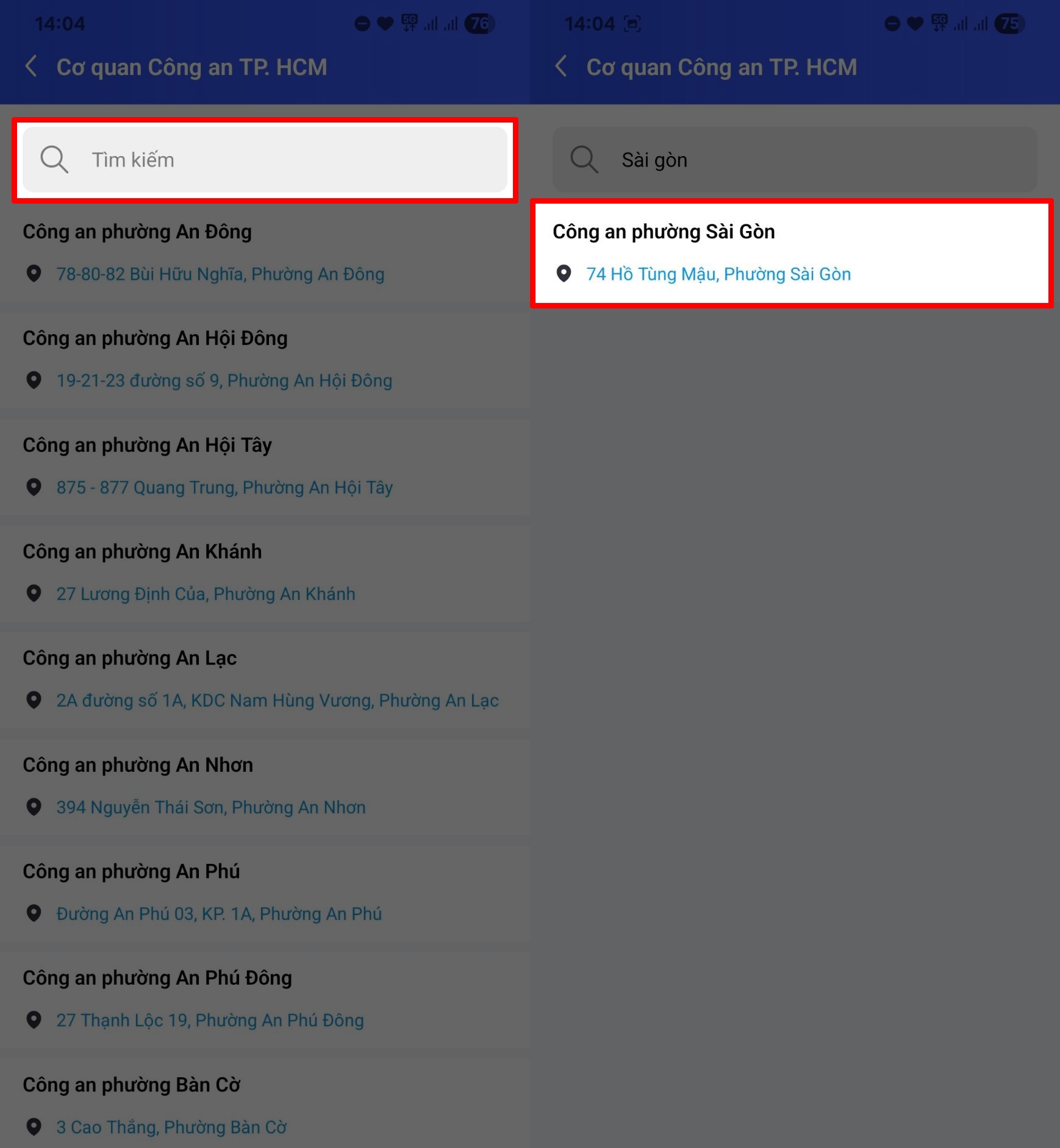 Bước 3: Ngay tại thanh tìm kiếm ở đầu giao diện, bạn hãy nhập tên phường hoặc xã mới mà bạn đang sinh sống sau khi sáp nhập. Hệ thống sẽ lập tức hiển thị danh sách các cơ quan công an có liên quan, kèm theo địa chỉ chính xác của đơn vị công an phụ trách khu vực đó.